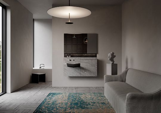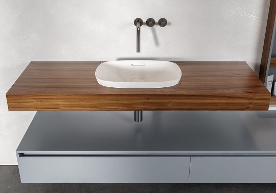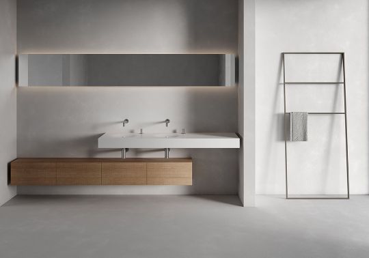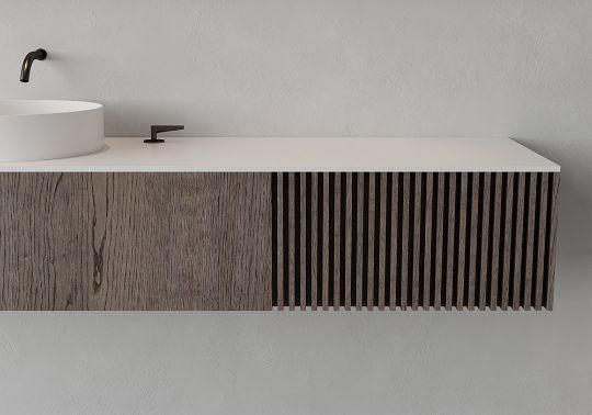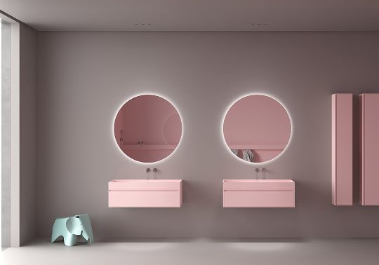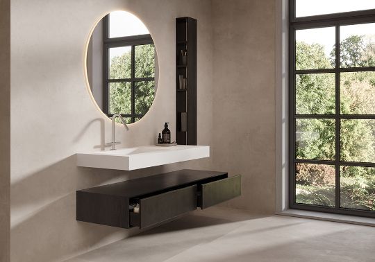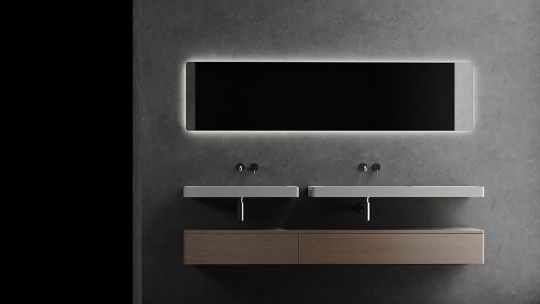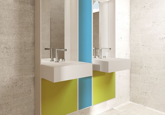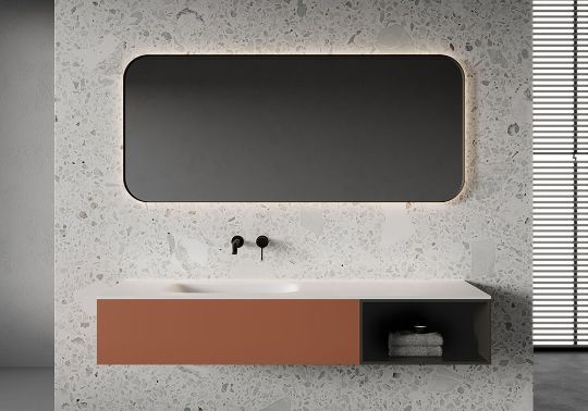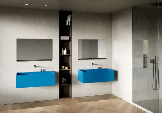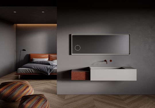 Geometry Коллекция мебели для ванной комнаты, сочетающая в себе контрастные формы и различные отделки.